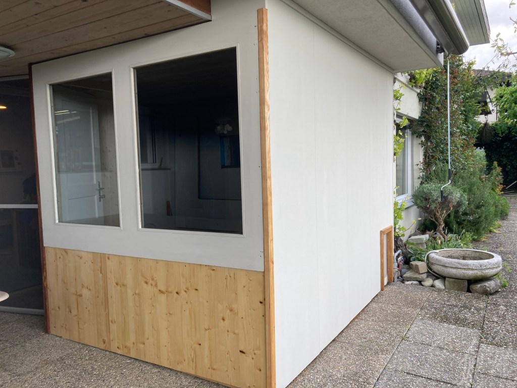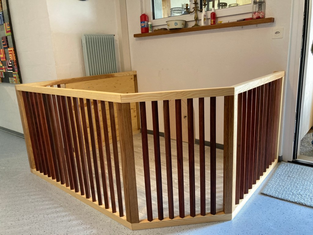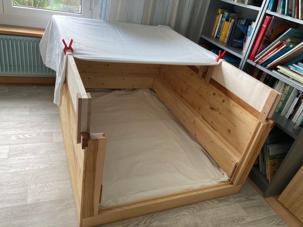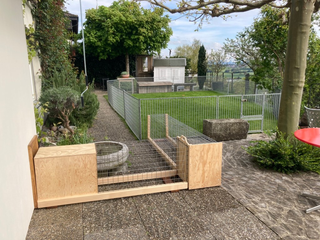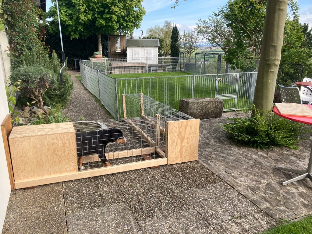 So – jetzt weiss es auch das Wildschwein imWald: Soba’s Welpen kommen Ende April auf die Welt.Startschuss zum Bau des WelpenhausesDas Gehege für die Welpen im Haus ist fertig montiert. Der Rohbau des Welpenhauses steht. Für den Innenausbau bleibt uns noch etwas Zeit.Der grosse Tag darf kommen – die Wurfkiste steht bereit.Auch das Welpenhaus lässt sich sehen.